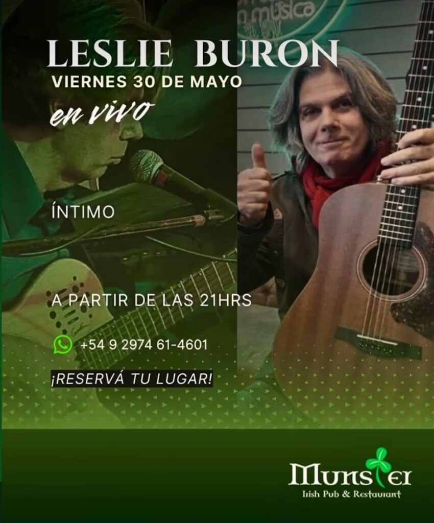 – En Munster Irish Pub & Restaurant, desde las 21:00, se presenta Leslie Burón en un show íntimo.