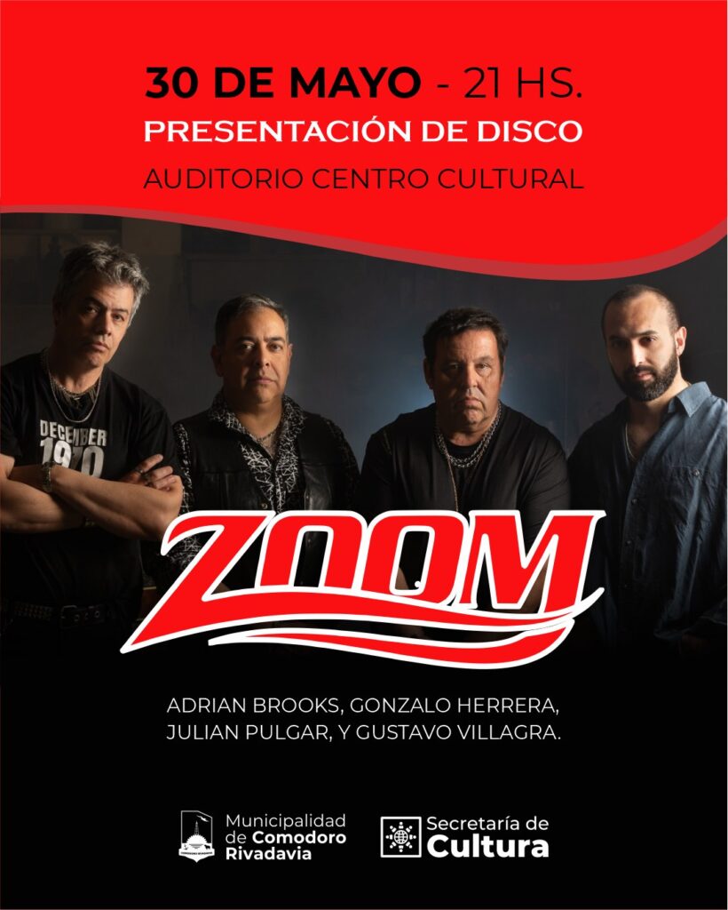 – En el Auditorio del Centro Cultural, la banda de rock Zoom presenta su álbum homónimo desde las 21:00, con entrada libre y gratuita. El grupo está compuesto por Adrián Brooks (guitarra, voz y coros), Gustavo Villagra (guitarra rítmica, voz líder y coros), Julián Pulgar (bajo) y Gonzalo Heredia (batería).