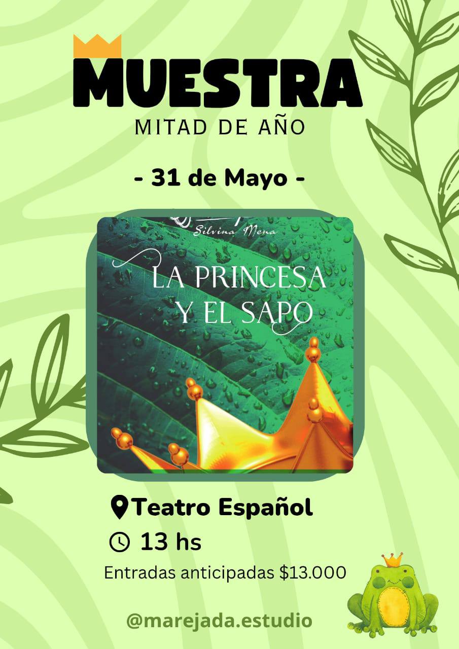 – En el Teatro Español, a las 13:00, se realiza la muestra de mitad de año del Estudio de Danza Marejada, de Silvina Mena, junto al musical “La Princesa y el Sapo”. Las entradas anticipadas tienen un valor de $13.000.