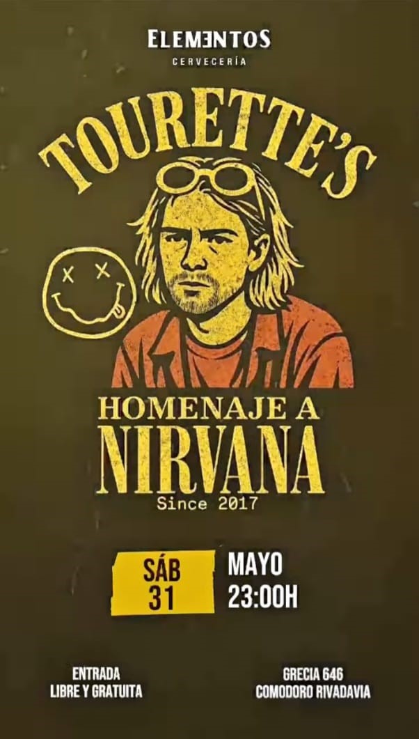 – En Elementos Cervecería, desde las 23:00, se presenta Tourette’s, banda homenaje a Nirvana.