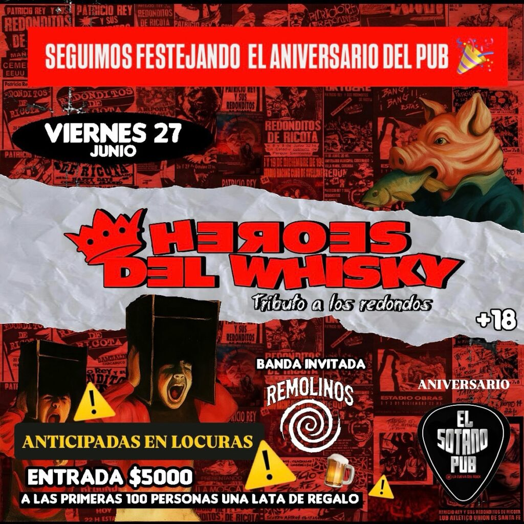 – En El Sótano Pub se presenta Héroes del Whisky (tributo a Patricio Rey y sus Redonditos de Ricota), junto a la banda invitada Remolinos. Las entradas anticipadas con descuento se consiguen a $5.000 en Locuras (solo ticket físico y hasta dos por persona) y las primeras 100 con una lata de regalo. También se pueden adquirir vía WhatsApp al 297-52888945.Puerta y boletería abren a las 21:00. El ingreso es para mayores de 18 años.