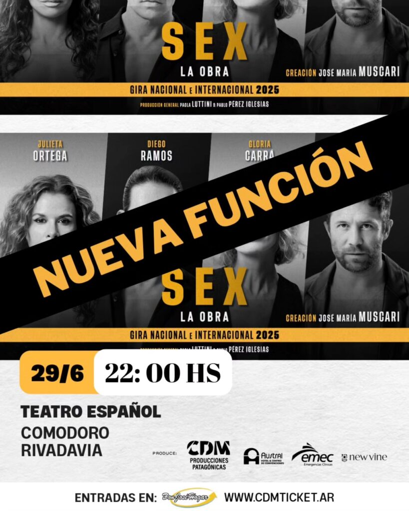 – Tras agotar localidades, «Sex, la obra» suma una función más en el Teatro Español, desde las 22:00. Las entradas físicas se adquieren en boletería de Don José Hogar, o vía online ingresando a www.cdmticket.ar. Este espectáculo teatral vanguardista, creado por José María Muscari, explora el universo del sexo, el deseo, los tabúes y la diversidad sexual a través de una combinación de baile, música, teatro y acrobacias. En esta nueva versión, los protagonistas son Diego Ramos, Gloria Carrá, Julieta Ortega y Nicolás Riera.