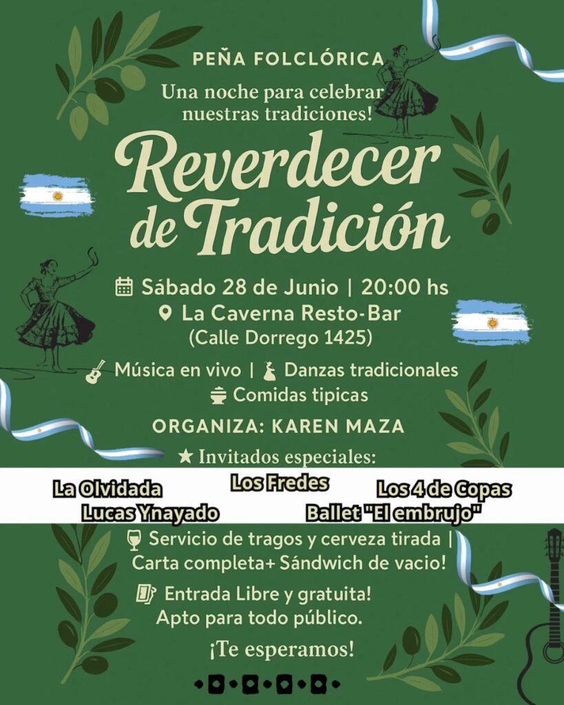 – En La Caverna Resto-Bar se realiza la Peña Folclórica «Revedecer de Tradición», a partir de las 20:00, con música en vivo, danzas tradicionales y comidas típicas. Organiza Karen Maza y se presentan Ballet «El Embrujo», Lucas Ynayado, Los Fredes, La Olvidada y Los 4 de Copa. La entrada es libre y gratuita.