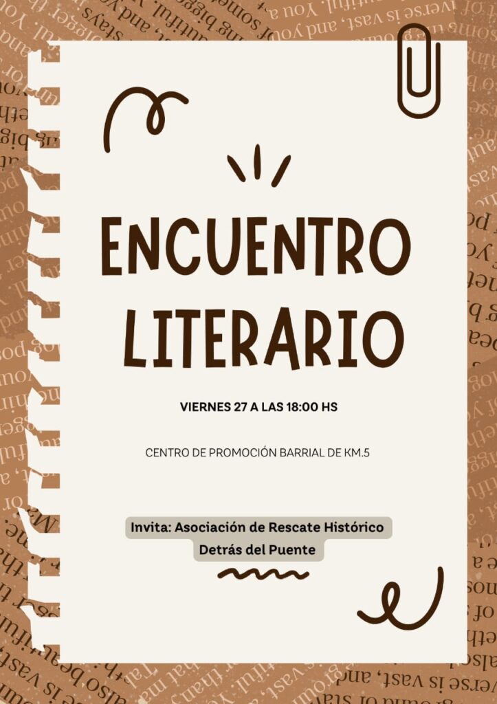 – En el Centro de Promoción Barrial de Kilómetro 5, se realiza un encuentro literario organizado por la Asociación de Rescate Histórico “Detrás del Puente”, a partir de las 18:00.
