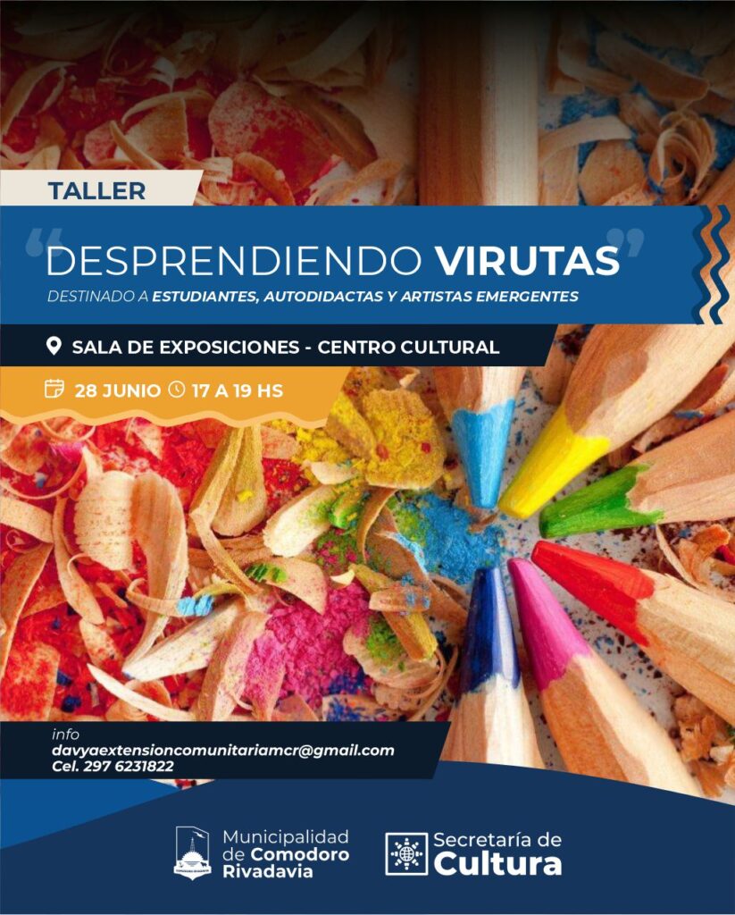 – En la Sala de exposiciones del Centro Cultural, de 17:00 a 19:00, se realiza el taller “Desprendiendo Virutas”, una propuesta pensada para estudiantes, autodidactas y artistas emergentes que quieran explorar nuevas formas de expresión. Un espacio de encuentro para descubrir, aprender y crear desde lo más simple: la viruta, la textura y el trazo. Para más información, los interesados pueden comunicarse al correo davyaextensioncomunitariamcr@gmail.com, o al celular 297-6231822.