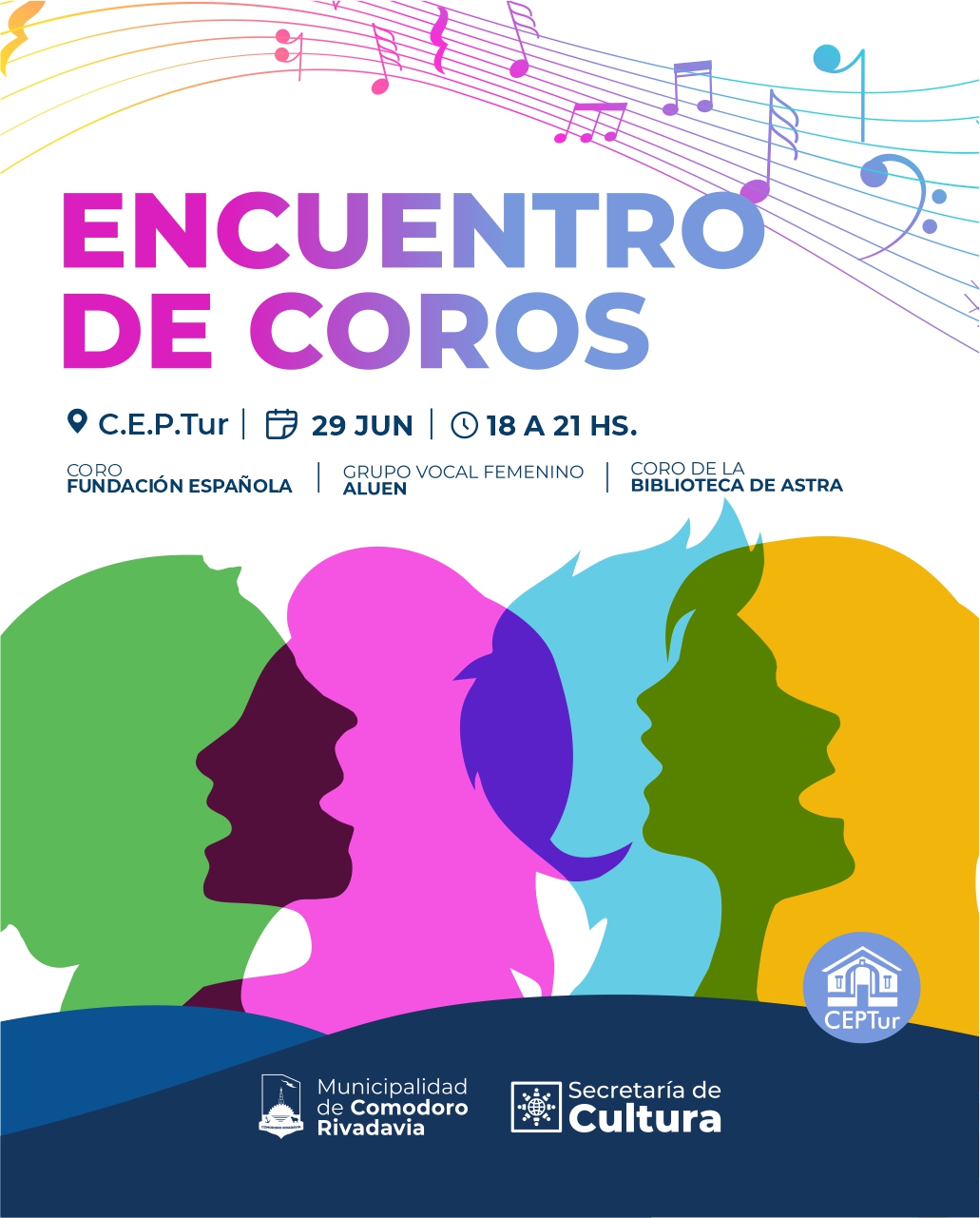 – En el CEPTur hay “Encuentro de Coros – Una tarde de voces compartidas”, de 18:00 a 21:00. Participan el Coro de la Fundación Española, el Grupo Vocal Femenino Aluén y el Coro de la Biblioteca de Astra. La entrada es libre y gratuita.