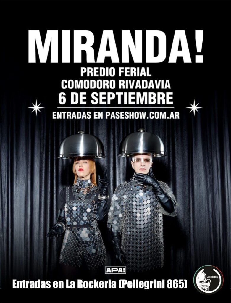 – En el Predio Ferial se presenta Miranda!, a partir de las 21:00. El dúo pop más importante de Latinoamérica, compuesto por Ale Sergi y Juliana Gattas, llega en medio de una gira que incluye a Paraguay, Ecuador, Chile y Uruguay. Brillo, luces, pantallas gigantes, diferentes vestuarios y coreografías, forman parte de una puesta en escena que invita a vivir una experiencia inolvidable.