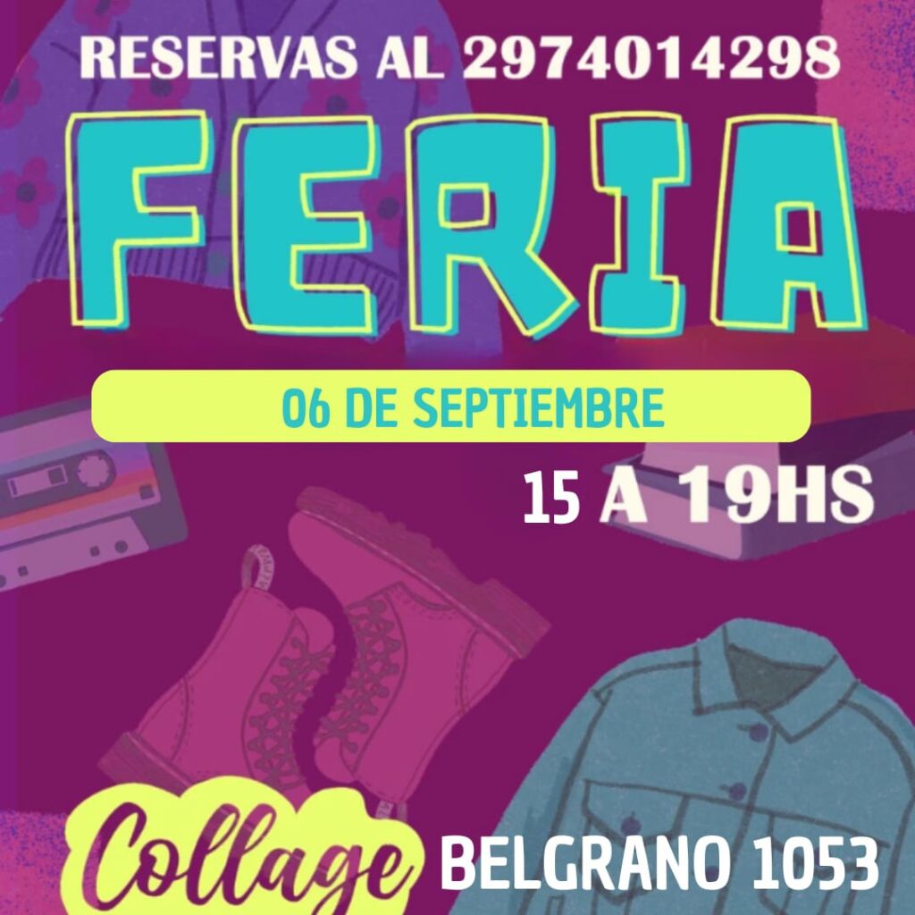 – En Collage hay feria, de 15:00 a 19:00. Los feriantes que quieran reservar lugar, pueden comunicarse al 297-4014298.