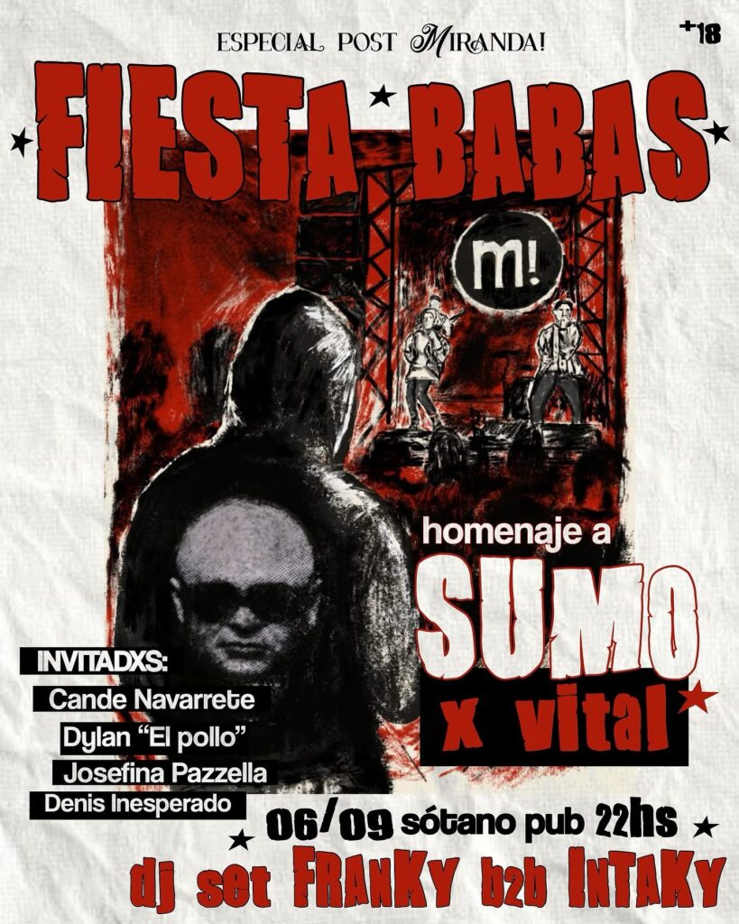 – En El Sótano Pub se realiza la “Fiesta Babas Post Miranda”, con la presentación de Vital (homenaje a Sumo), junto a Cande Navarrete, Dylan “El Pollo”, Josefina Passella y Denis Inesperado como invitados. Además, van a estar los DJ Frankkystein e Intaky, para bailar toda la noche. Las puertas abren a las 22:00.