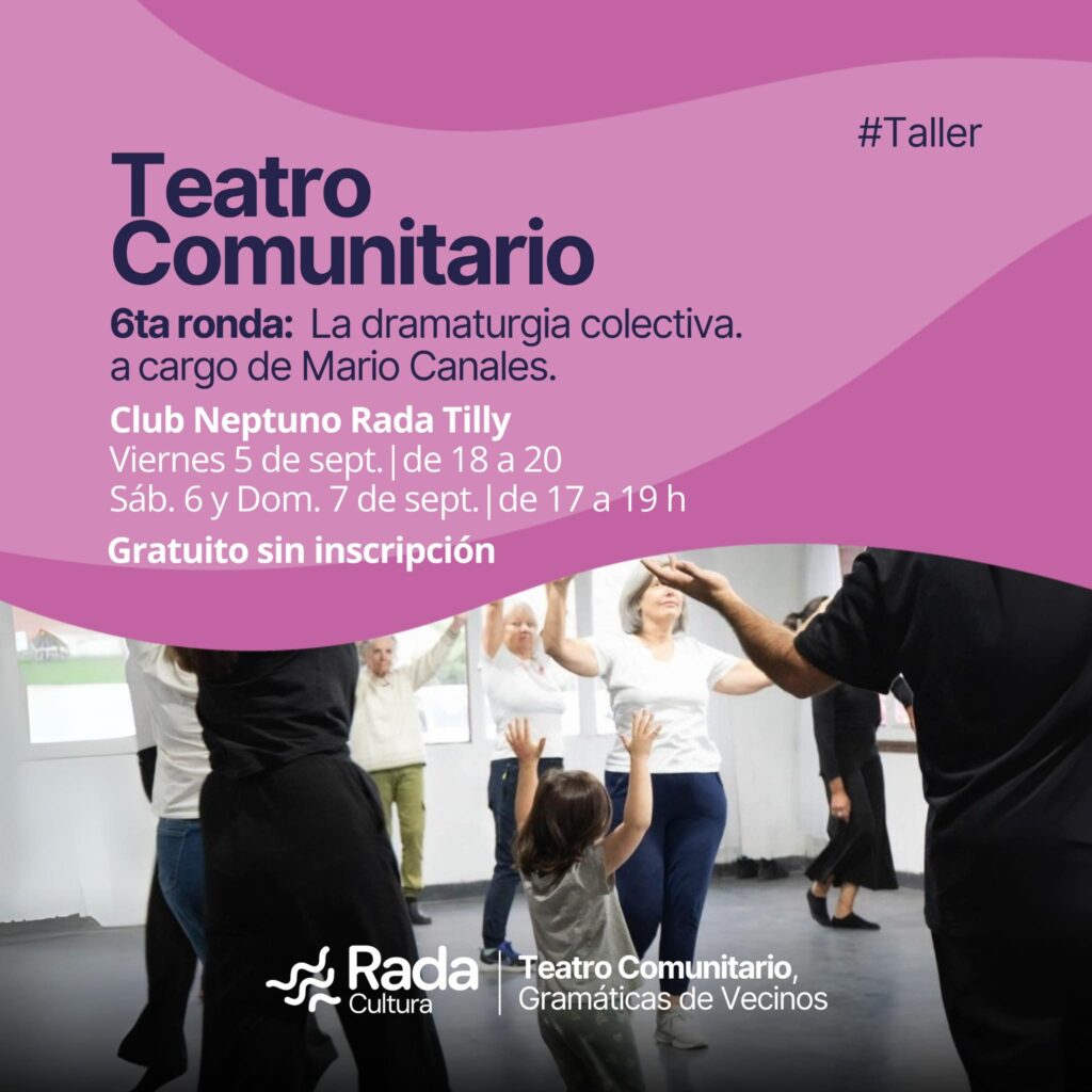 – En el Club Neptuno de Rada Tilly, con entrada libre y gratuita, se realiza una nueva edición del programa de Teatro Comunitario, esta vez, centrada en la dramaturgia colectiva y el trabajo del cuerpo como herramienta expresiva. La propuesta, coordinada por el profesor y director Mario Canales, convoca a vecinas y vecinos de todas las edades, con o sin experiencia previa, a sumarse a un espacio de creación compartida. Se trabaja con juegos dramáticos, improvisaciones, escritura y ejercicios de puesta en escena. El viernes, la actividad se desarrolla de 18:00 a 20:00, mientras que sábado y domingo será entre las 17:00 y las 19:00.