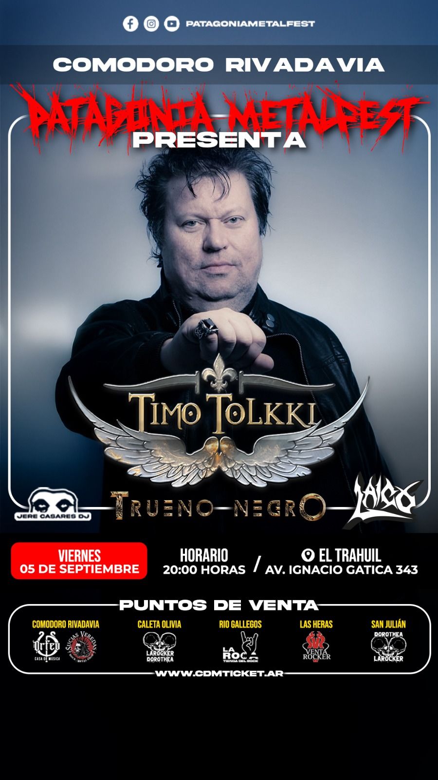 – En El Trahuil se presenta Timo Tolkki, el guitarrista finlandés fundador de la banda de power metal Stratovarius. Las bandas invitadas locales son Laico y Trueno Negro, que a su vez formará parte del grupo de músicos que acompañarán a Tolkki, inclusive en el show del sábado en Buenos Aires. Las puertas abren a las 20:00. Abre Trueno Negro, sigue Timo Tolkki y cierra Laico.