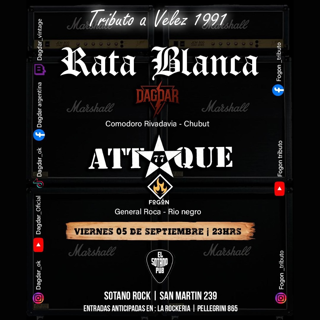 – En El Sótano Pub, desde las 23:30, se presentan Dagdar (tributo a Rata Blanca) y, desde General Roca, El Fogón (tributo a Attaque 77). Las entradas en puerta cuestan $8.000.