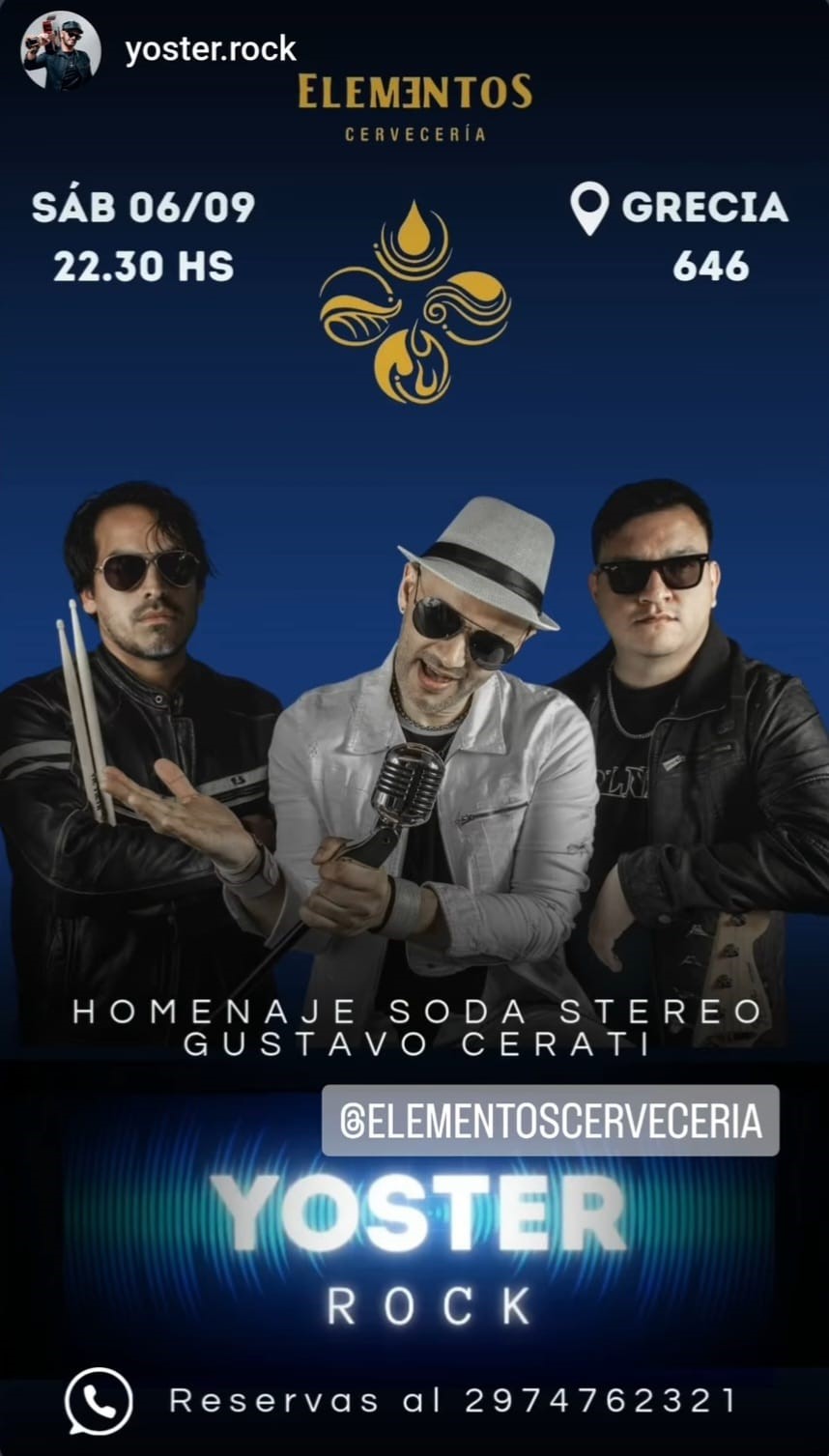 – En Elementos Cervecería, desde las 22:30, se presenta Yoster, con su homenaje a Soda Estéreo y Gustavo Cerati.