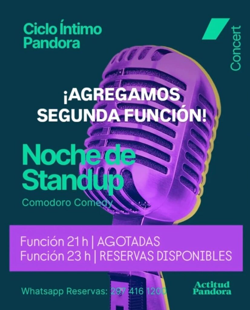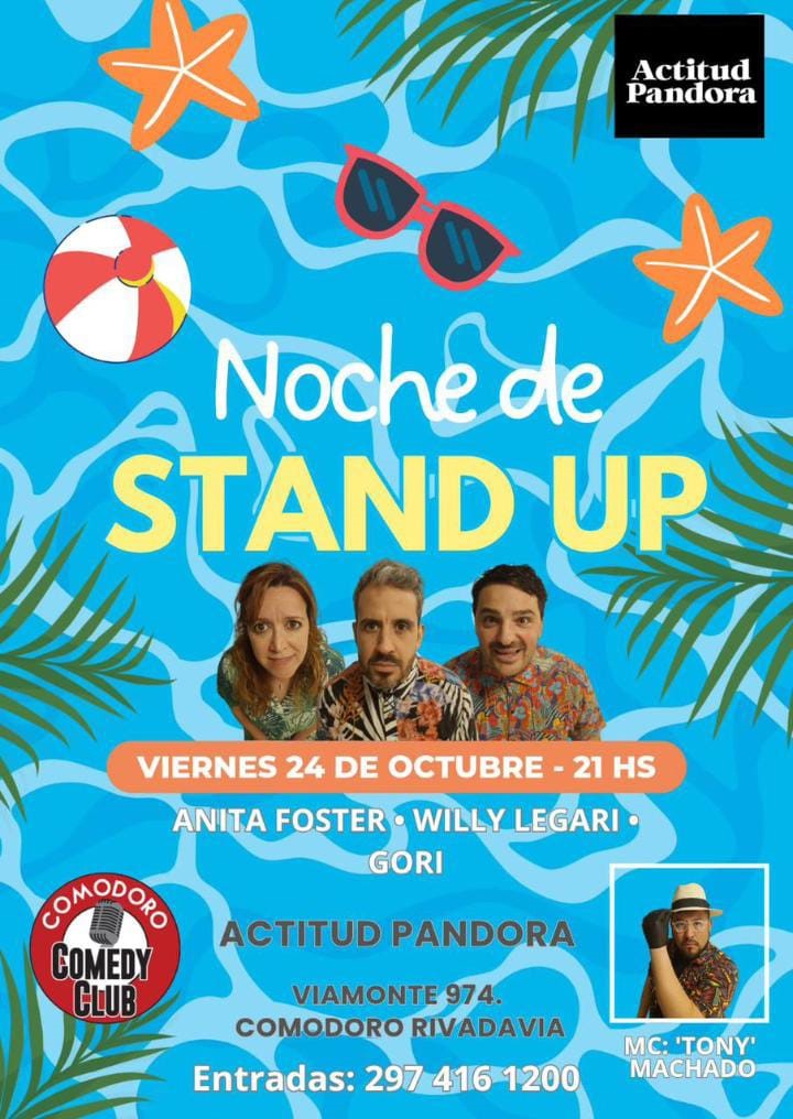 – En Actitud Pandora (Viamonte 974) hay Noche de Stand Up, con Anita Foster, Willy Legari y Gori. La función de las 21:00 se agotó y se agregó otra para las 23:00. Reservas, al 297-4161200.