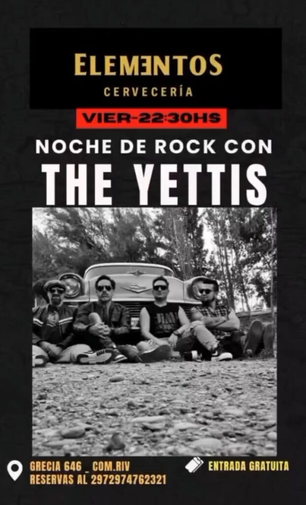 – En Elementos Cervecería (Grecia 646) hay noche de rock nacional e internacional con dos bandas en vivo: The Yettis (22:30) y Vileces (00:30).