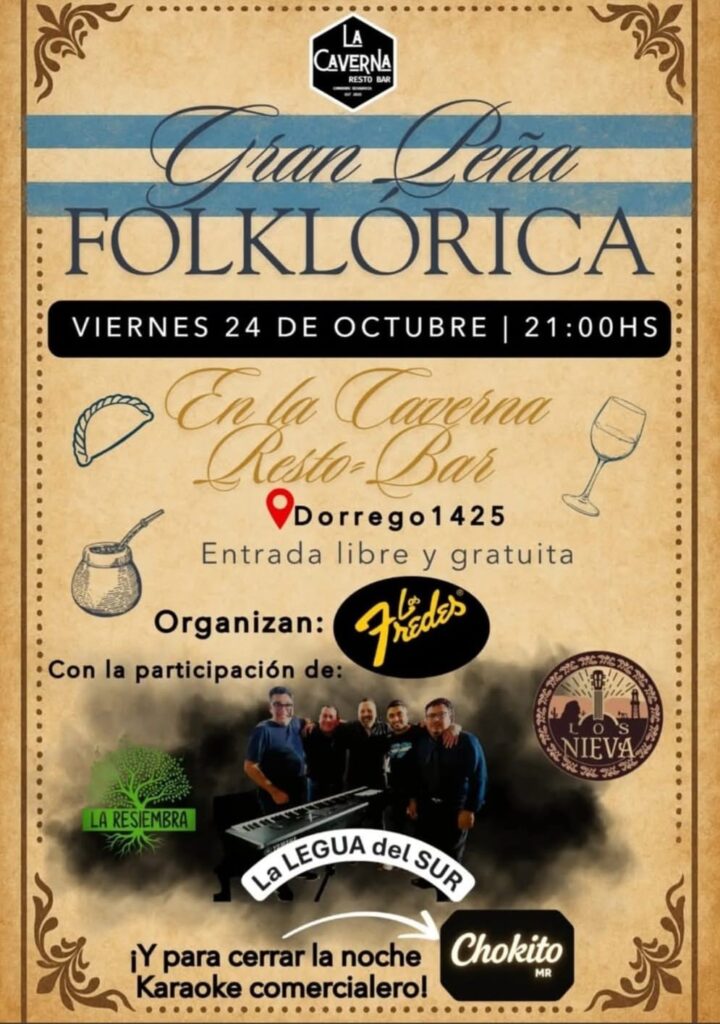 – En La Caverna Resto-Bar (Dorrego 1425), a partir de las 21:00, hay Gran Peña Folklórica, con entrada libre y gratuita. Una noche llena de música, danza, comida y tradición organizada por Los Fredes, con la participación especial de La Legua del Sur, Los Nieva y La Resiembra. Y para cerrar la noche con todo, se presenta Chokito, a puro karaoke comercialero.