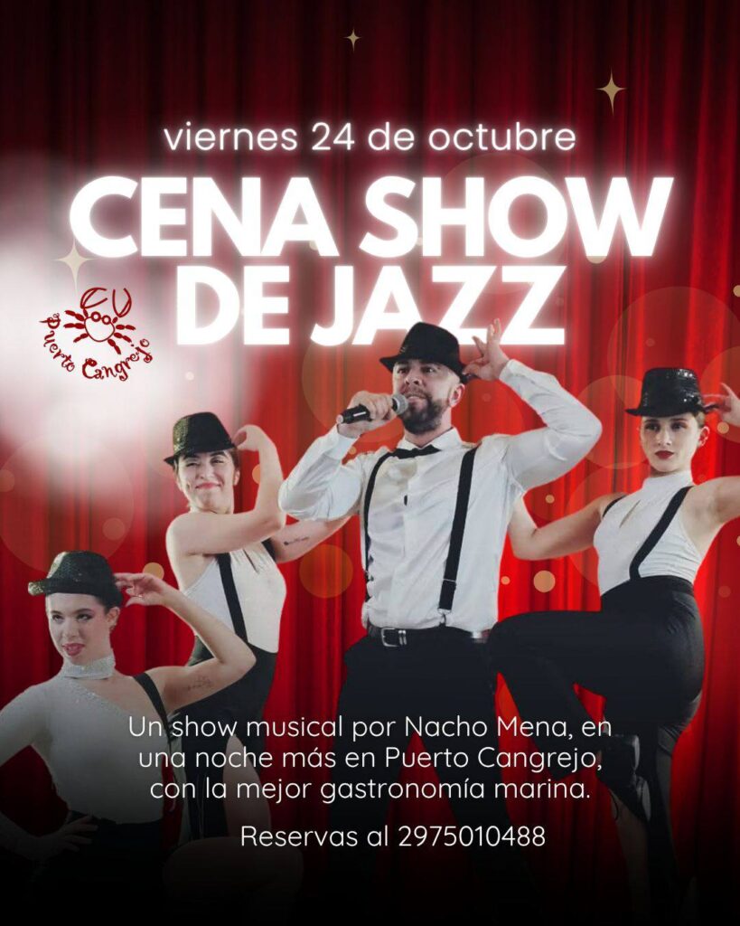 – En Puerto Cangrejo (Luis Mora 1051, Costanera), a partir de las 21:30, hay Cena Show de Jazz, con Nacho Mena, las bailarinas Lihuén Nahuelquir y Marianela Oyarzun y los cantantes Pablo Romero y Denis Rybier. Reservas, al 297-5010488.