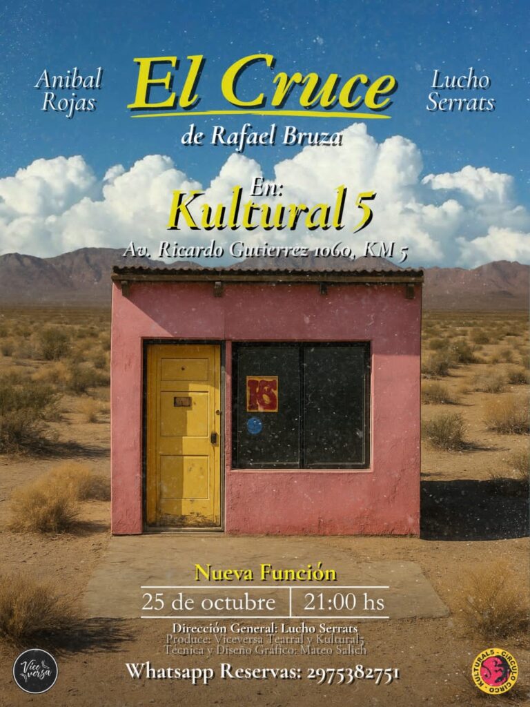 – En Kultural 5 (Gutiérrez 1060, Km 5), desde las 21:00, se presenta la obra “El cruce”, de Rafael Bruza. La estepa sureña y sus surcos encuentra a dos peregrinos en búsqueda incansable. El camino, la intemperie y el territorio, se mezclan en esta aventura de encontrar algún vestigio del presente. Actúan Aníbal Rojas y Lucho Serrats, quien se encarga de la dirección general y del diseño sonoro. Mateo Salich se ocupa de la técnica, asistencia de dirección y diseño gráfico. Producen Viceversa y Kultural 5. Reservas, a @viceversateatral o @kultural5_circulocirco.