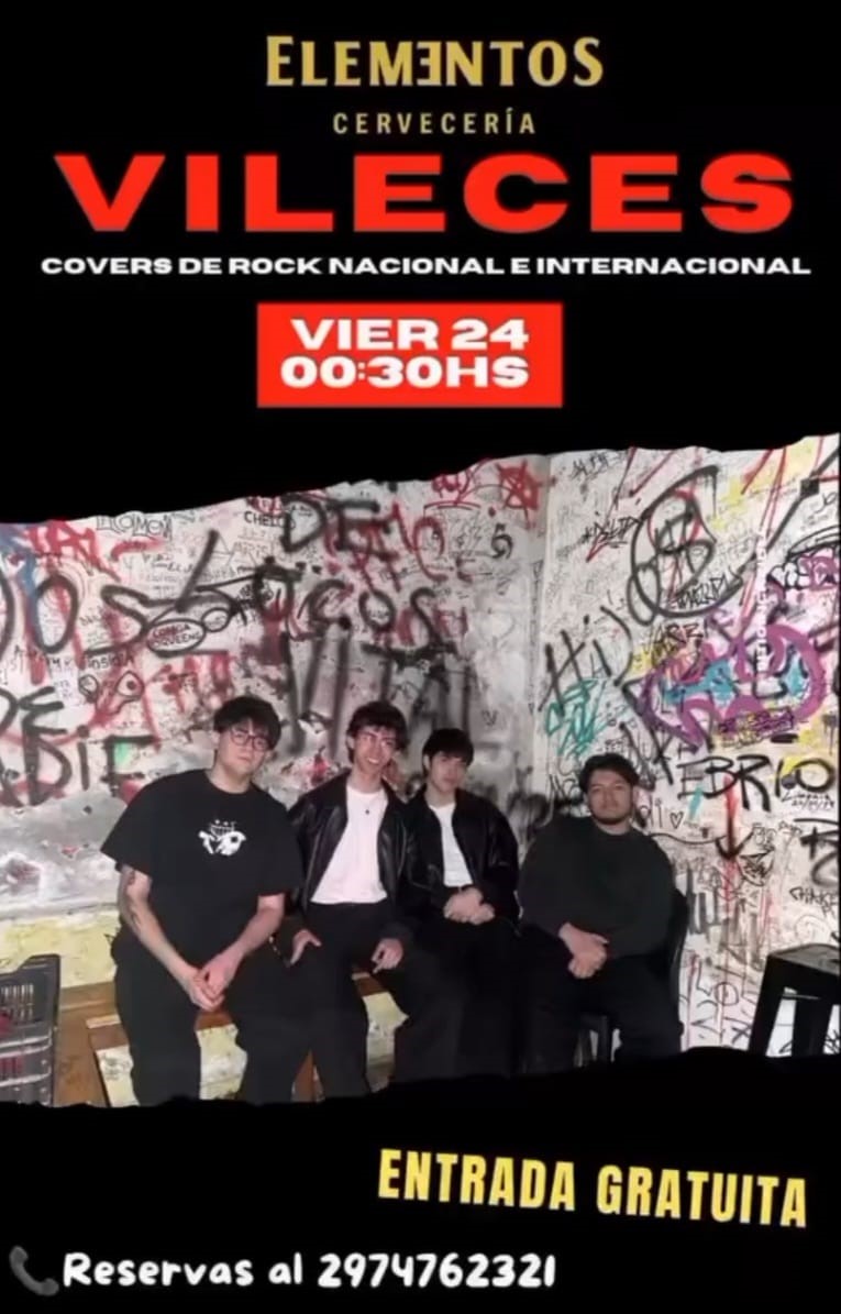 – En Elementos Cervecería (Grecia 646) hay noche de rock nacional e internacional con dos bandas en vivo: The Yettis (22:30) y Vileces (00:30).