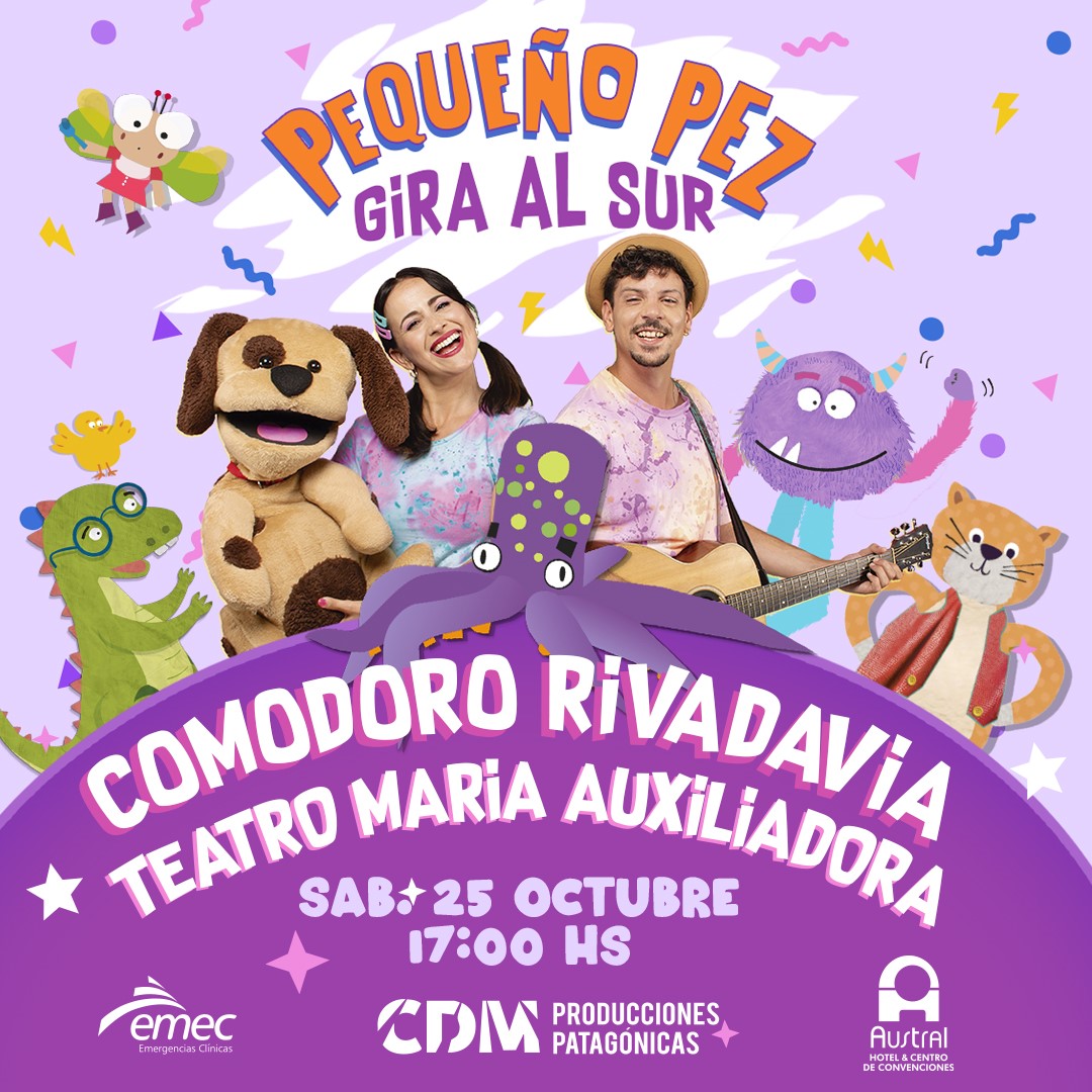 – En el Teatro María Auxiliadora, a partir de las 17:00, se presenta el show infantil de “Pequeño Pez”, una banda musical que viene conquistando corazones en todo el mundo. El espectáculo musical, con títeres, teatro y danza, es una fiesta sonora, donde los instrumentos cobran vida y pasean entre distintos géneros musicales, desde el rock n’ roll hasta el reggae, la cumbia, la salsa o el swing, la chacarera y la murga.