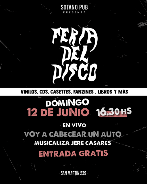 Agenda 100 Visto 10 junio, 2022 DOMINGO 12 – Feria del Disco en “El Sótano Pub”, desde las 16:30 hs. En vivo: Voy A Cabecear Un Auto. Musicaliza: Jere Casares. Entrada gratis. Compartir: ¿Te gustó el post?
