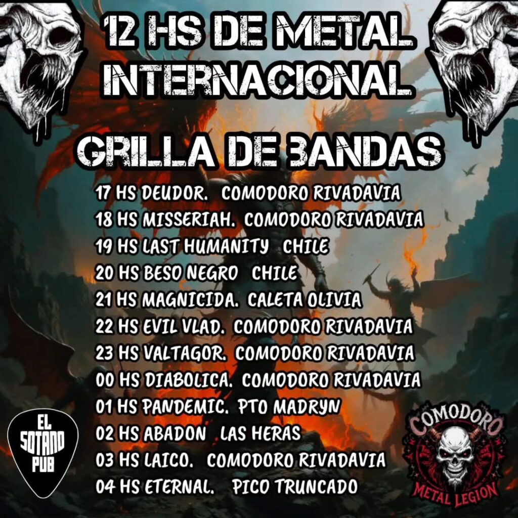 Comodoro Metal Legion regresa con su histórico festival y redoblando la apuesta: el “12 Horas de Metal Internacional”. La cita es en El Sótano Pub, este sábado desde las 17:00. Las puertas abrirán a las 16:00 y la primera banda arrancará a las 17:00. La puntualidad es fundamental y se respetará a rajatabla, ya que son 12 bandas y el evento dura 12 horas. Nada más que aclarar, por si hacía falta.