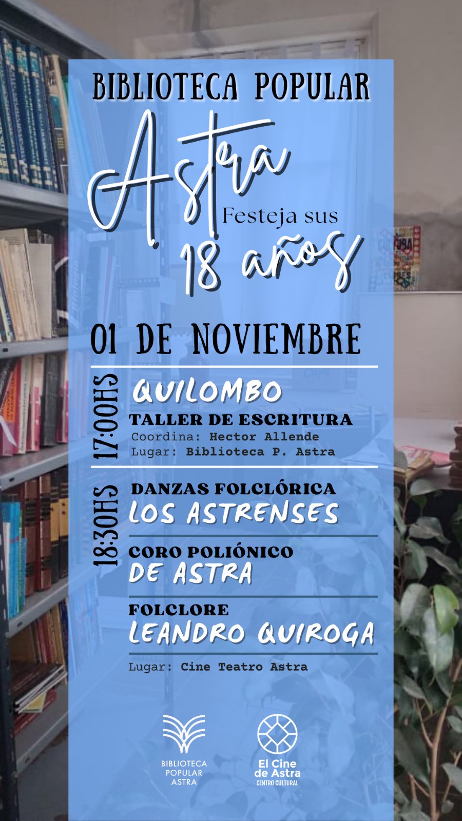 La Biblioteca Popular Astra cumple 18 años y los festeja con literatura en vivo, danza y música. La jornada se extenderá desde la tarde hasta la noche en dos escenarios, donde el público podrá disfrutar de diferentes actividades de manera libre y gratuita.