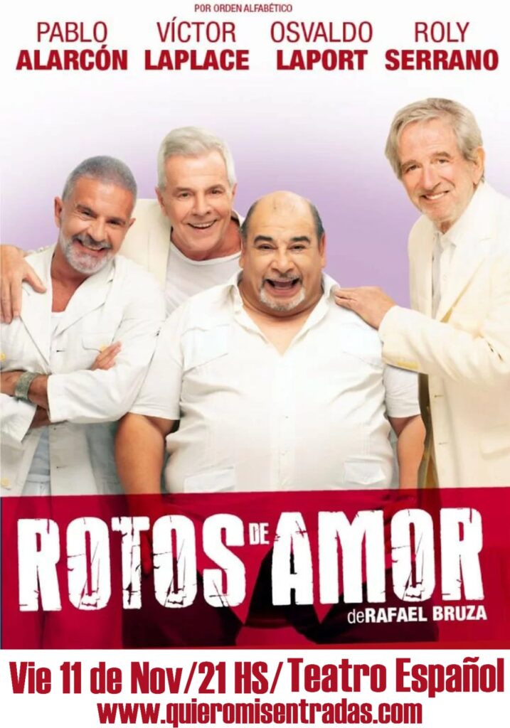 ¿Quién alguna vez no dejó todo por amor, o tuvo un amor no correspondido? Imposible. ¿O quién no pasó por los avatares de una separación? Todos, alguna vez, vivimos alguna de estas situaciones y justamente la obra “Rotos de Amor” llega a la escena local para ponerle humor, reflexión y emoción a lo que a cualquier persona pudo haberle pasado mientras estuvo enamorada. Y llega con un elenco de lujo, integrado por Pablo Alarcón, Osvaldo Laport, Víctor Laplace y Roly Serrano.