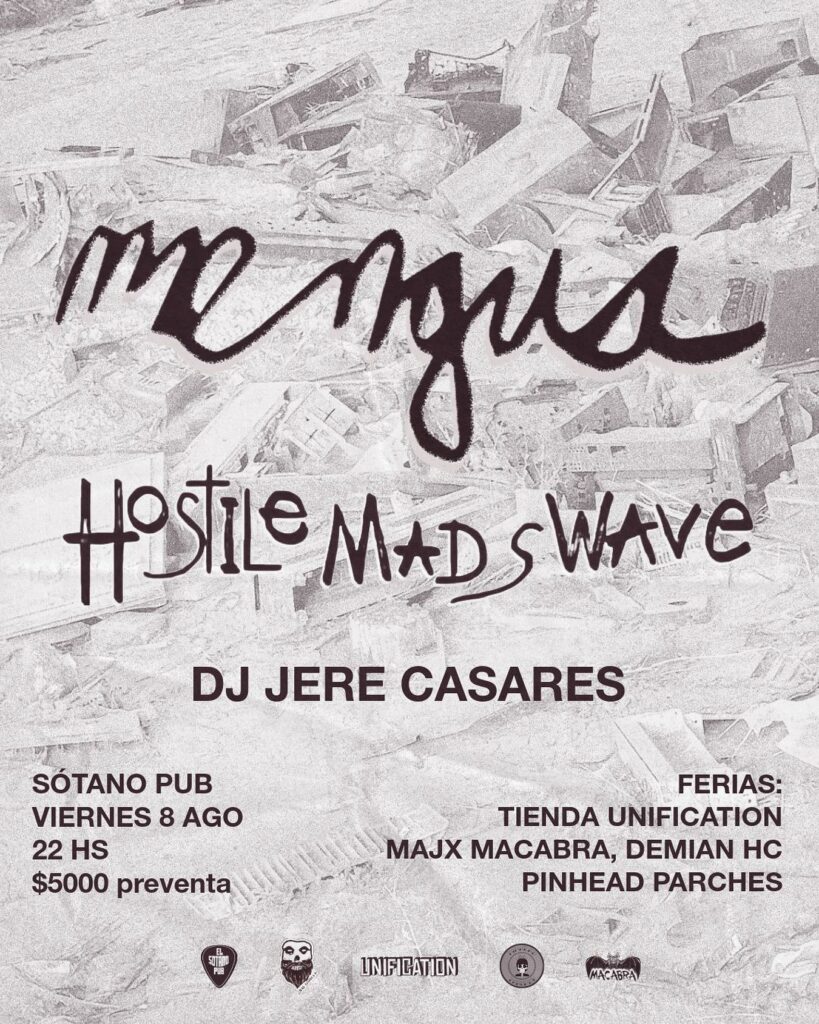 – En El Sótano Pub se presenta Mengua, junto a Hostile Mads Wave y el DJ Jere Casares musicalizando la noche. Además, se prenden ferias amigas. Las puertas abren a las 22:00 y las entradas anticipadas tienen un valor de $5.000, realizando una transferencia al alias menguaband.