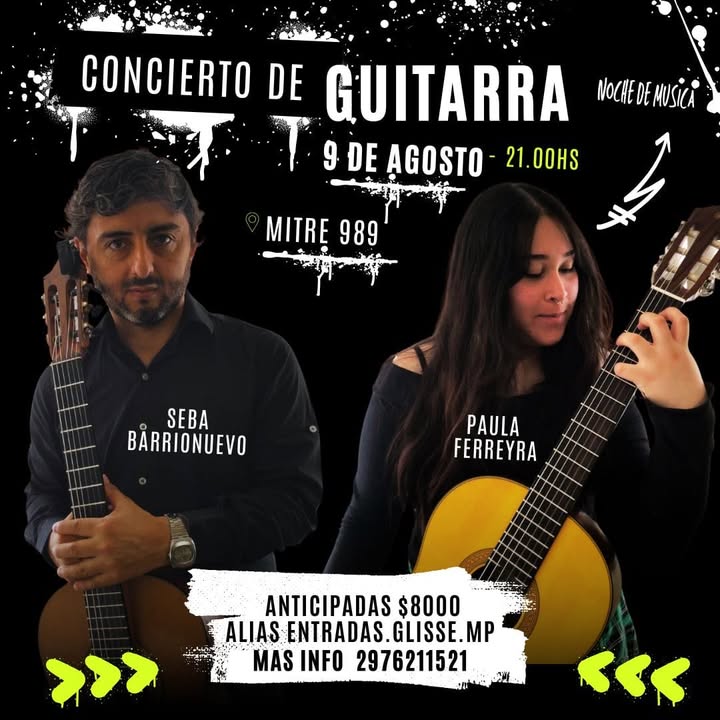 – En Espacio Urbano, desde las 21:00, hay concierto de guitarra con Glissé, el dúo compuesto por Seba Barrionuevo y Paula Ferreyra. Las entradas anticipadas tienen un valor de $8.000 y se adquieren haciendo una transferencia al alias entradas.glisse.mp