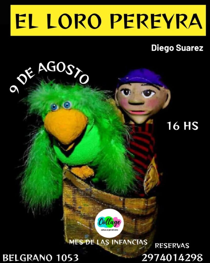 – En Collage, desde las 16:00, hay función de títeres con «El Loro Pereyra». Una historia divertida y conmovedora para toda la familia, presentada por el titiritero Diego Suárez. Consultá por tus entradas al 297-4014298.