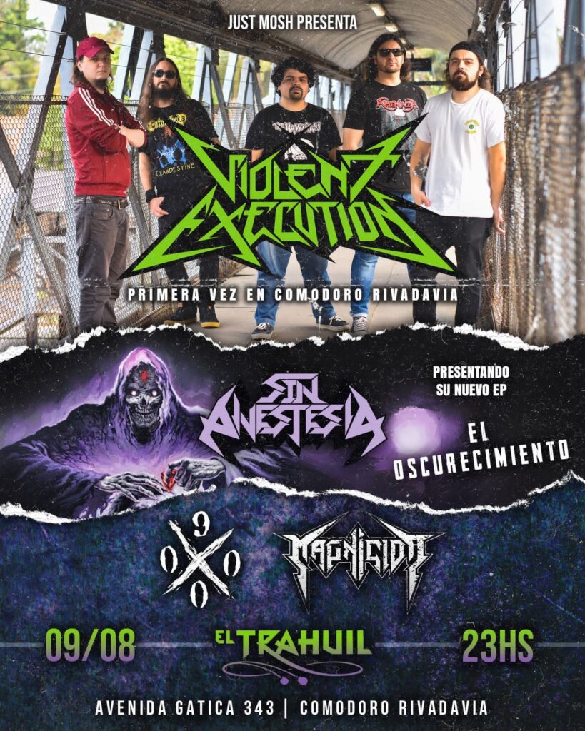 – En El Trahuil hay noche de thrash, crossover y hardcore, a partir de las 23:00. Desde Buenos Aires, llega Violent Execution, para compartir escenario con los comodorenses Sin Anestesia (que presenta su nuevo EP “El oscurecimiento”) y 9000, sumado a la visita de Magnicida, de Caleta Olivia.