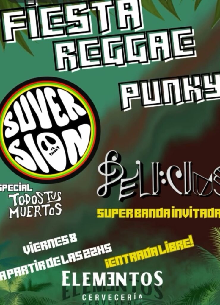 – En Elementos Cervecería, desde las 22:00, hay fiesta reggae y punky, con Suversión y su especial de Todos Tus Muertos y Delicious, con superbanda invitada.