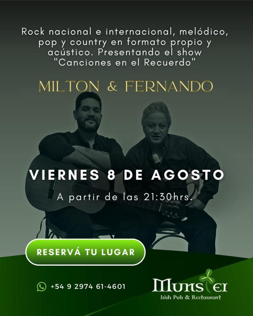 – En Munster Irish Pub & Restaurant, a partir de las 21:30, Milton y Fernando presentan su show “Canciones en el recuerdo”, donde sonará rock nacional e internacional, melódico, pop y country, en formato propio y acústico.