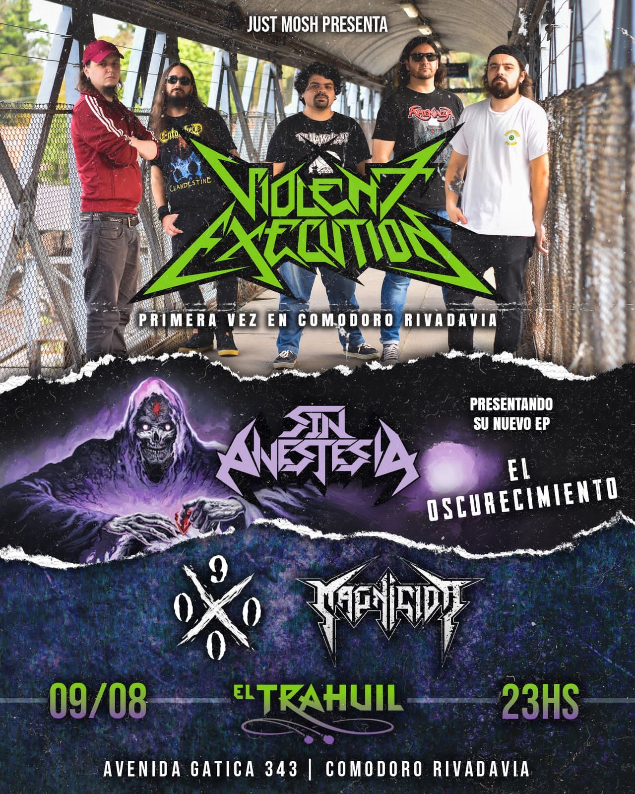 – En El Trahuil hay noche de thrash, crossover y hardcore, a partir de las 23:00. Desde Buenos Aires, llega Violent Execution, para compartir escenario con los comodorenses Sin Anestesia (que presenta su nuevo EP “El oscurecimiento”) y 9000, sumado a la visita de Magnicida, de Caleta Olivia.