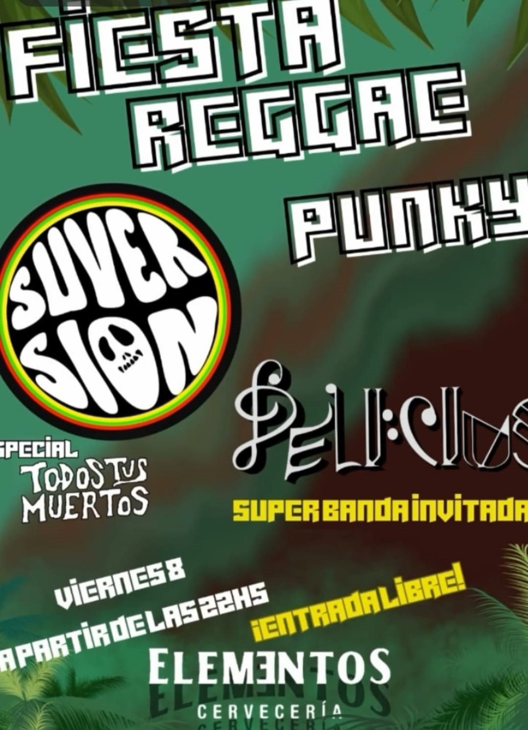 – En Elementos Cervecería, desde las 22:00, hay fiesta reggae y punky, con Suversión y su especial de Todos Tus Muertos y Delicious, con superbanda invitada.