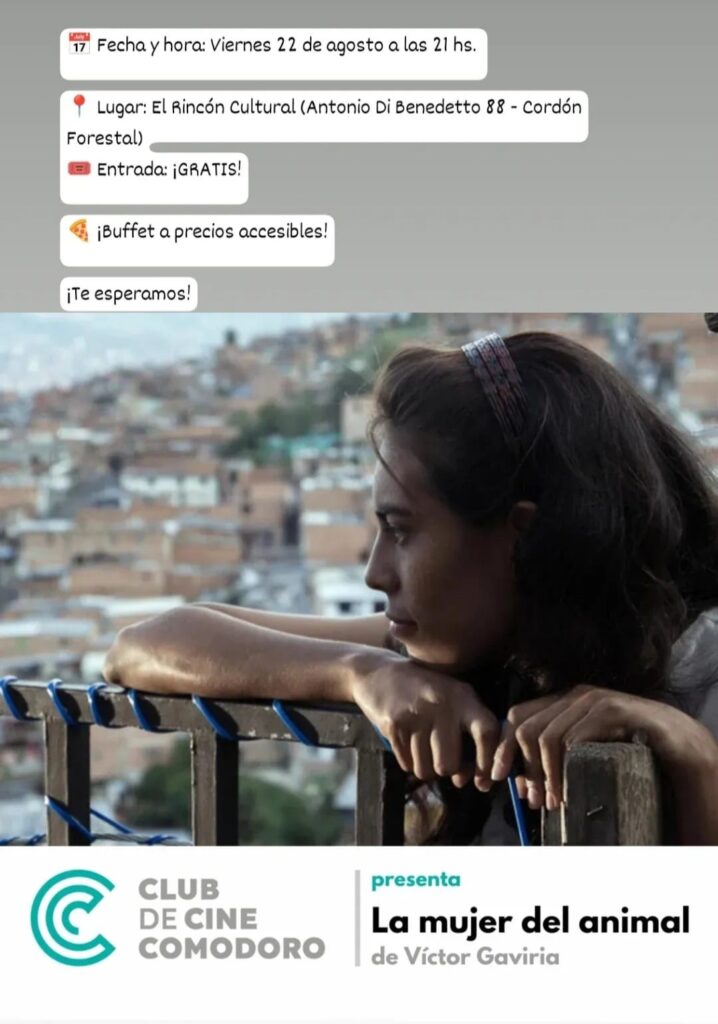 – En el Rincón Cultural del Cordón Forestal, desde las 21:00, el Club de Cine Comodoro presenta “La mujer del animal”, de Víctor Gaviria. La entrada es libre y gratuita y hay buffet.