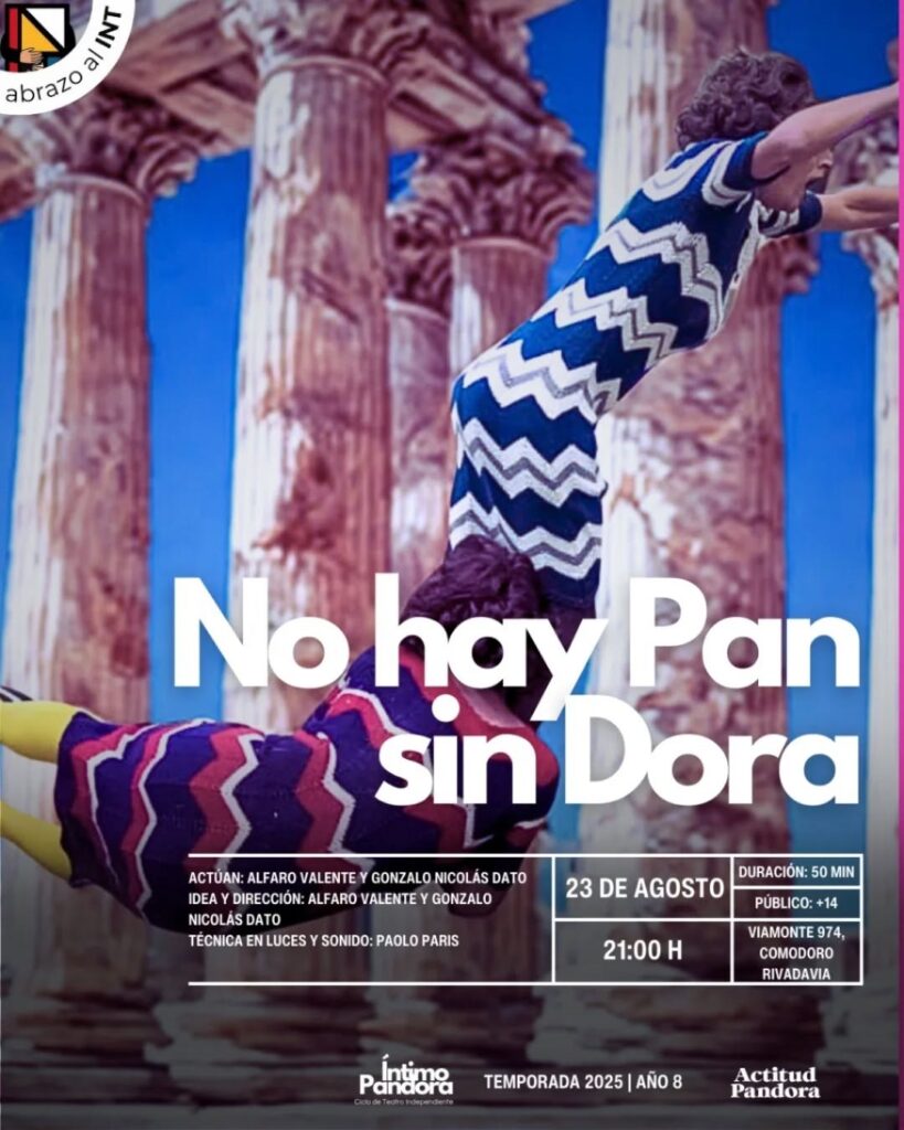 – En Actitud Pandora, desde las 21:00, se presenta la obra “No hay Pan sin Dora”, con Alfaro Valente y Gonzalo Dato, quienes están a cargo de la dirección. Paolo Paris se encarga de la técnica en luces y sonido. Las reservas se hacen al 297-4161200.