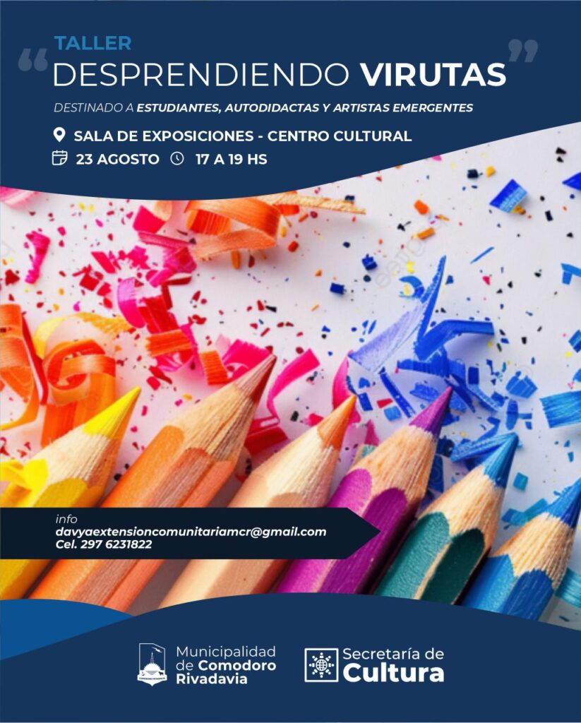 – En la Sala de Exposiciones del Centro Cultural, de 17:00 a 19:00, se realiza el taller “Desprendiendo Virutas”, una propuesta pensada para estudiantes, autodidactas y artistas emergentes que quieran explorar nuevas formas de expresión. Un espacio de encuentro para descubrir, aprender y crear desde lo más simple: la viruta, la textura y el trazo.