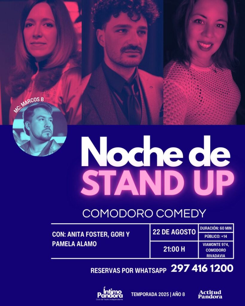 – En Actitud Pandora, a partir de las 21:00, Comodoro Comedy presenta su “Noche de Stand Up” con Anita Foster, Gori y Pamela Álamo. Las reservas se hacen al 297-4161200.