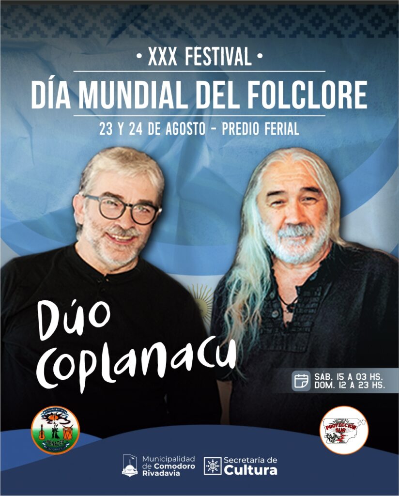 Te pasamos la agenda cultural de este 22, 23 y 24 de agosto en Comodoro Rivadavia y Rada Tilly. Hay mucha música en vivo para disfrutar, al igual que teatro, danza, audiovisuales y arte. Coincidiendo con el Día Mundial del Folklore, en distintos escenarios se presentan Nahuel Penissi, el Dúo Coplanacu y El Camaruco.