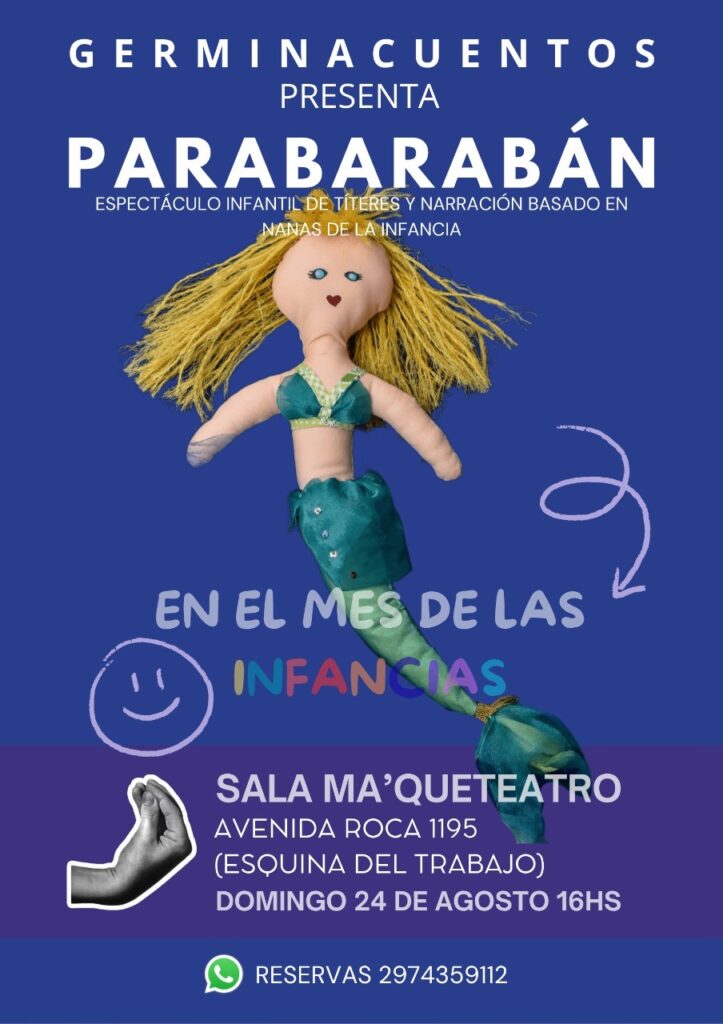 – En la sala Ma’ qué Teatro, a partir de las 16:00, el grupo Germinacuentos presenta “Parabarabán”, un espectáculo infantil de títeres y narración basado en nanas de la infancia. Las reservas se hacen al 297-4359112.