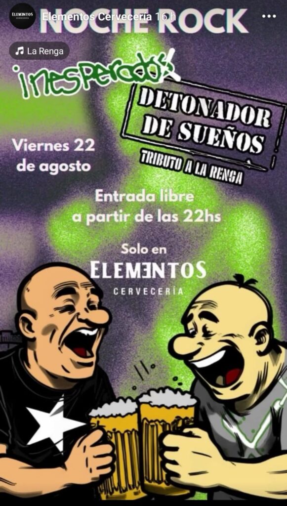 – En Elementos Cervecería, a partir de las 22:00, hay “Noche de Rock” con Detonador de Sueños (tributo a La Renga) e Inesperados.