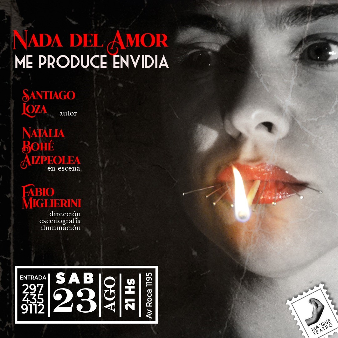 – En la sala Ma’ qué Teatro, desde las 21:00, se presenta la obra “Nada del amor me produce envidia”, del autor Santiago Loza, con la actuación de Natalia Bohé Aizpeolea. La dirección, escenografía e iluminación están a cargo de Fabio Miglierini. Las reservas se hacen al 297-4359112.