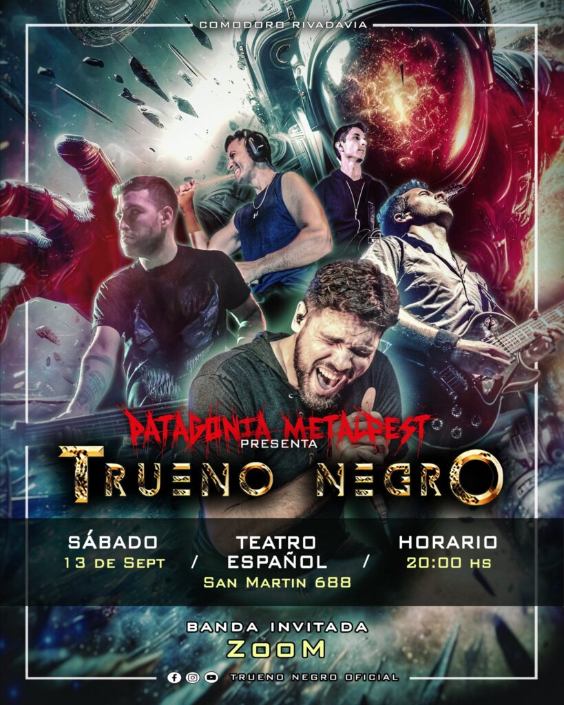 – En el Teatro Español, Trueno Negro presenta oficialmente su álbum “Neogénesis”, en un show sin precedentes para el metal comodorense, donde además estarán los hardrockeros Zoom como invitados. El show arranca a las 20:00. Las entradas a $20.000 se consiguen haciendo una transferencia al alias: truenonegro.teatro y enviando el comprobante a: truenonegro2025@outlook.com
