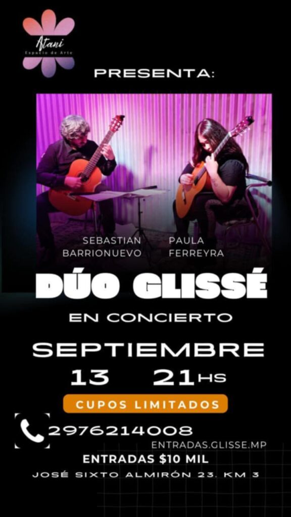 – En el espacio de arte “Atani” (José Sixto Almirón 23, Km. 3), se presenta el Dúo Glissé, compuesto por Sebastián Barrionuevo y Paula Ferreyra, desde las 21:00. La entrada tiene un valor de $10.000 y pueden adquirirse realizando una transferencia al alias: entradas.glisse.mp. Contacto: 297-6214008.