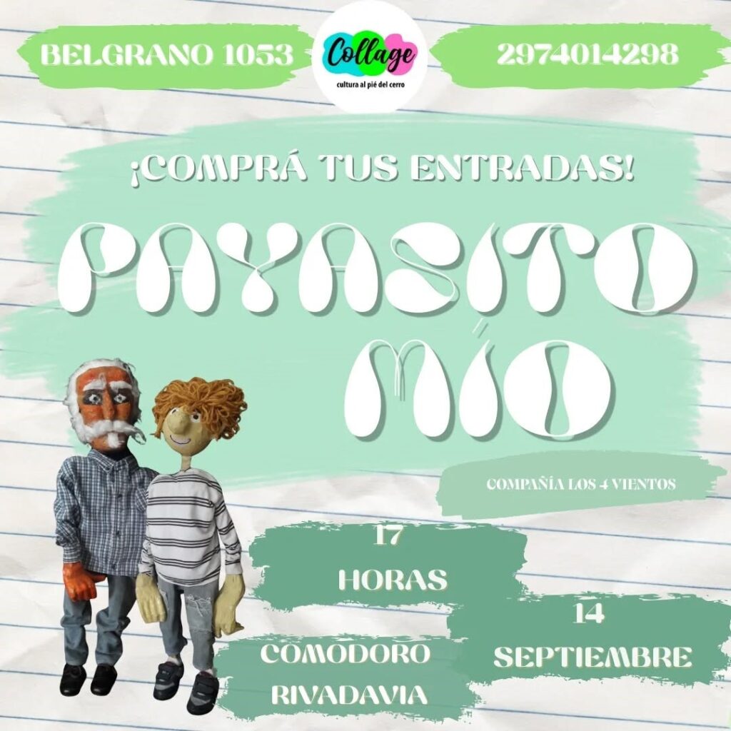 – En Collage, desde las 17:00, se presenta el show de títeres “Payasito mío”, un espectáculo lleno de humor, magia y ternura para reír y soñar, de la mano de la compañía “Los 4 Vientos”. Contacto por consultas y entradas: 2974014298.