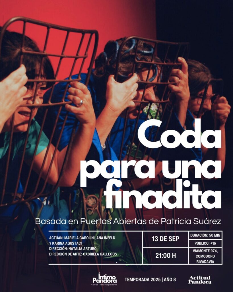 – En Actitud Pandora se presenta “Coda para una finadita”, a partir de las 21:00. En esta comedia negra, llena de humor, tres mujeres están atrapadas en un infierno que ofrece salidas, pero no se atreven a elegir. Reservas por WhatsApp, al 297-4161200.