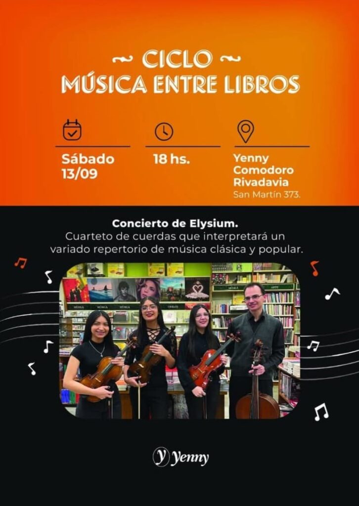 – En la librería Yenny, en el marco del ciclo “Música entre libros”, desde las 18:00 se presenta el cuarteto de cuerdas Elysium, con un variado repertorio de música clásica y popular.
