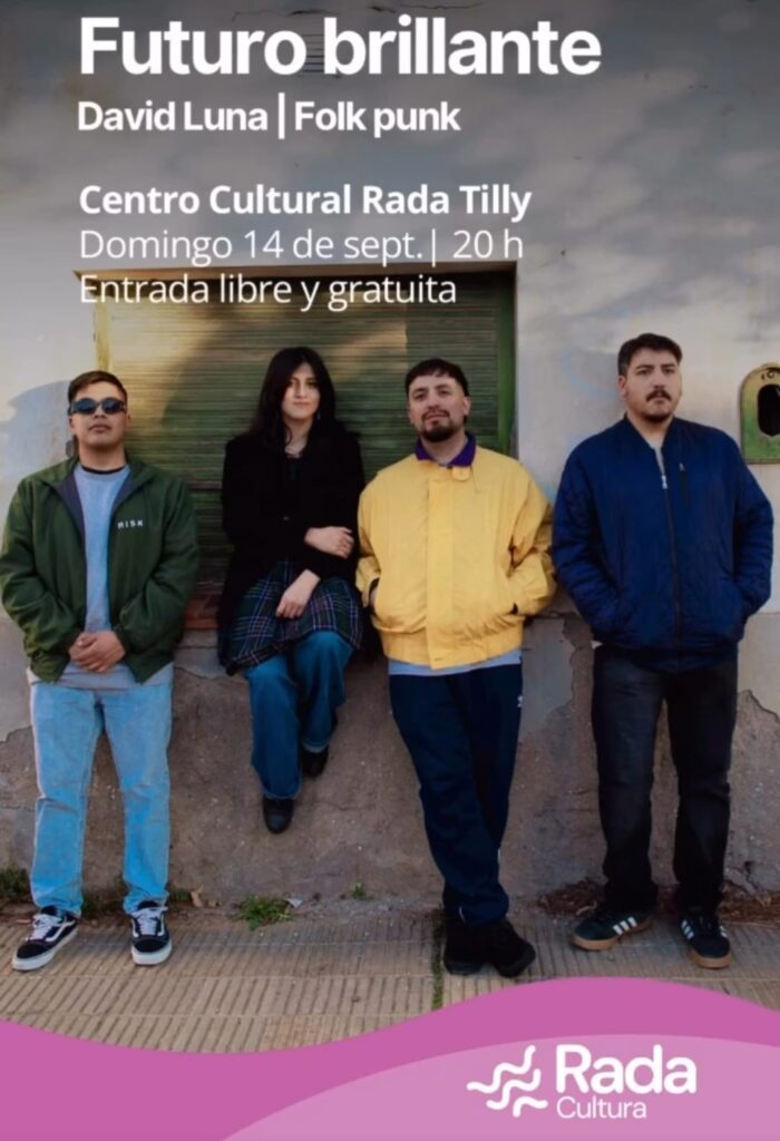 – En el Centro Cultural Rada Tilly, a partir de las 20:00, la banda de folk punk Futuro Brillante presenta su primer álbum “Algo bien!”, con entrada libre y gratuita.